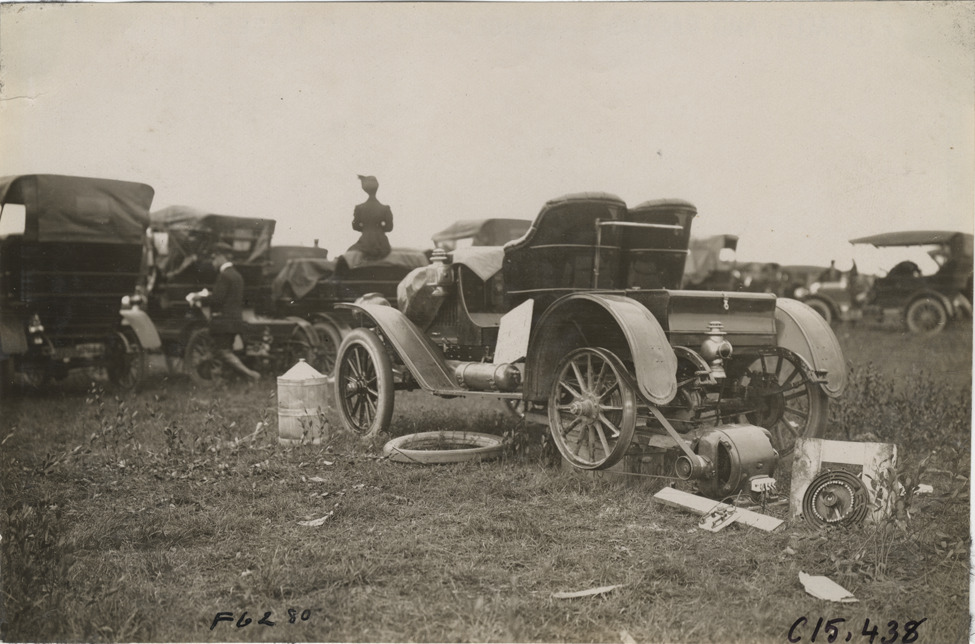 View of car on platform with rear wheel removed during the 1908 Vanderbilt Cup races on Long Island, New York. Repair parts are on ground in front of car. Handwritten on back: "Races and racing--Vanderbilt Cup races, 1908."