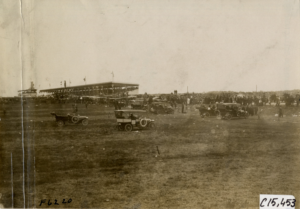 Distant view of cars parked in field during the 1908 Vanderbilt Cup races on Long Island, New York. Grandstand and spectators in background. Stamped on back: "Photo by N. Lazarnick, 29 West 42nd Street, N.Y., tel. 594 Bryant." Handwritten on back: "Races and racing--Vanderbilt Cup races, 1908."