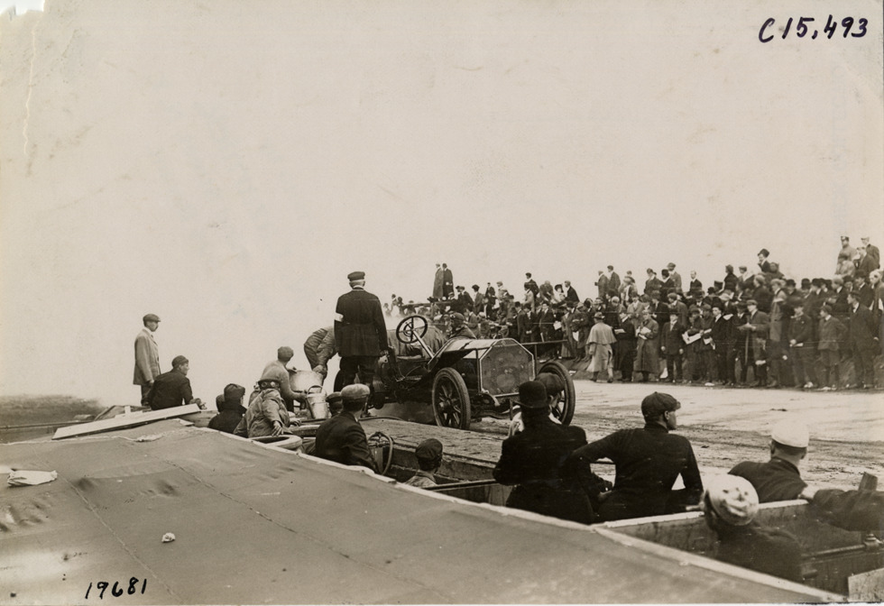 View of car no. 6 parked next to pits during the 1908 Vanderbilt Cup races on Long Island, New York. Spectators in background. Stamped on back: "Photo by N. Lazarnick, 29 West 42nd Street, N.Y., tel. 594 Bryant." Handwritten on back: "Races and racing--Vanderbilt Cup races, 1908."
