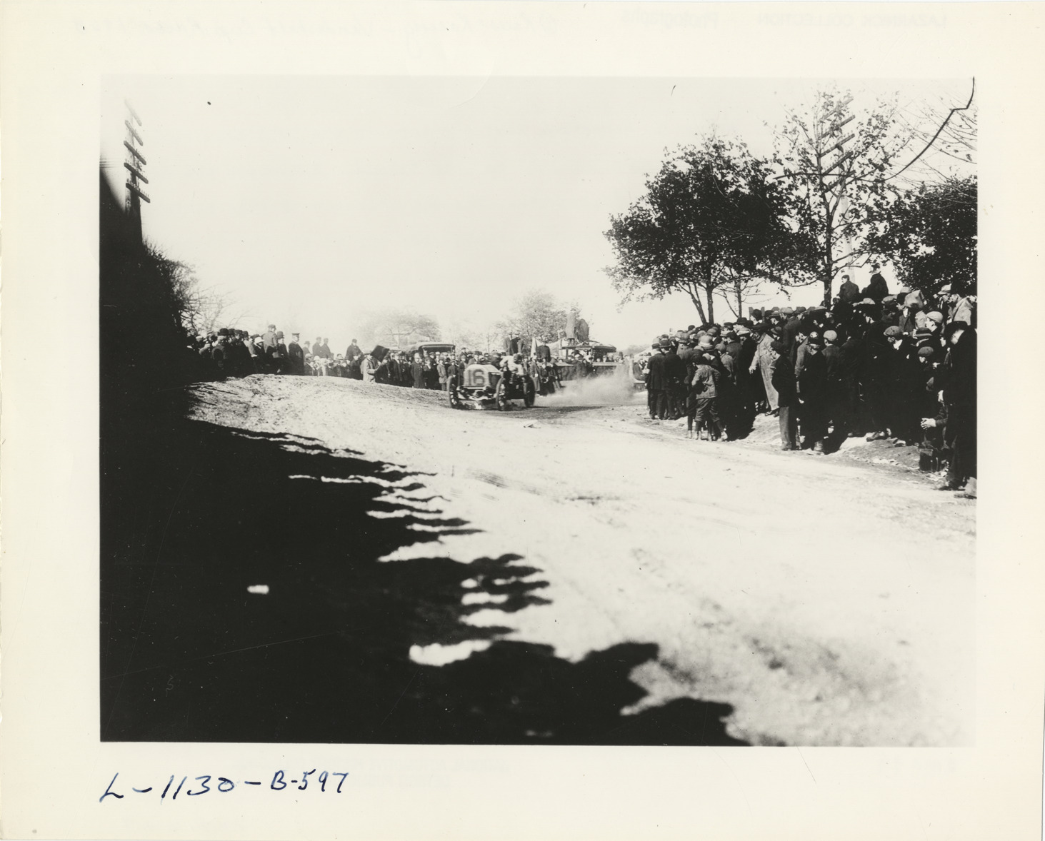 View of George Robertson and passenger racing Locomobile car no. 16 past spectators and officials' stand during the 1908 Vanderbilt Cup races on Long Island, New York. Typed on back: "George H. Robertson making a turn in the 1908 Vanderbilt Cup race held October 24, 1908 on Long Island. Robertson was driving a 90 horsepower Locomobile. The significance of this picture is that this was the first American made car to win the Vanderbilt Cup races since they were organized in 1904. In 1909, 1910, 1911, other American cars won the cup. Of the total of thirteen Vanderbilt road races, four were won by American cars and the remaining were split between French, German, and Italian makes. Handwritten on back: "Races and racing--Vanderbilt Cup races, 1908."