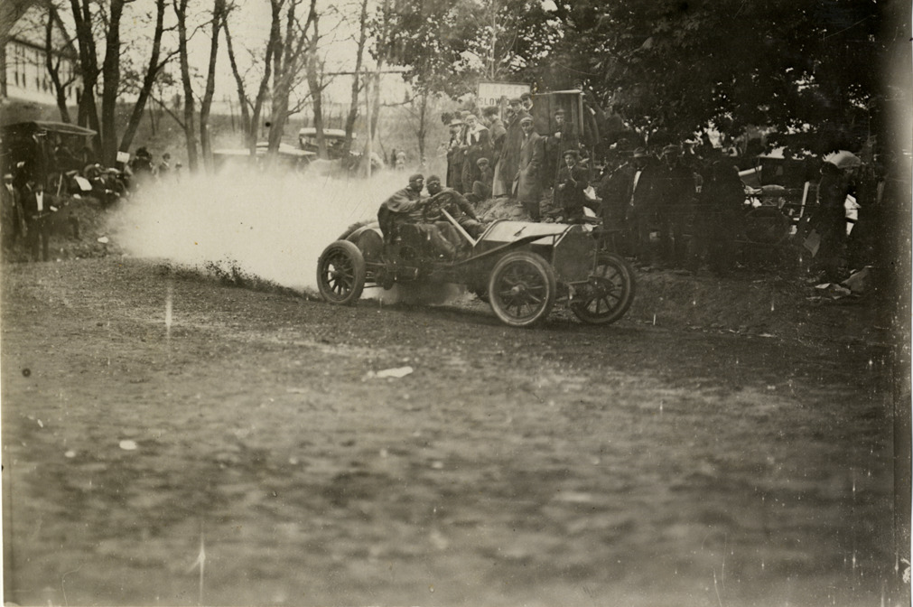 Driver and passenger in Isotta-Fraschini racecar on Woodbury turn, 1908 Vanderbilt Cup races