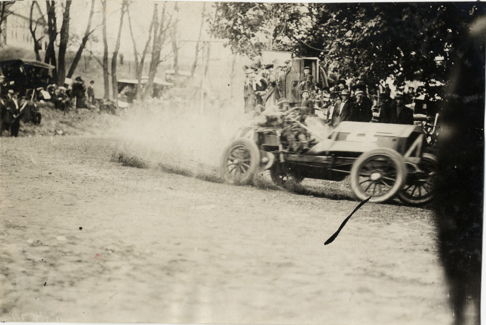 Driver and passenger in Chadwick racecar at Colyers Corner, 1908 Vanderbilt Cup races