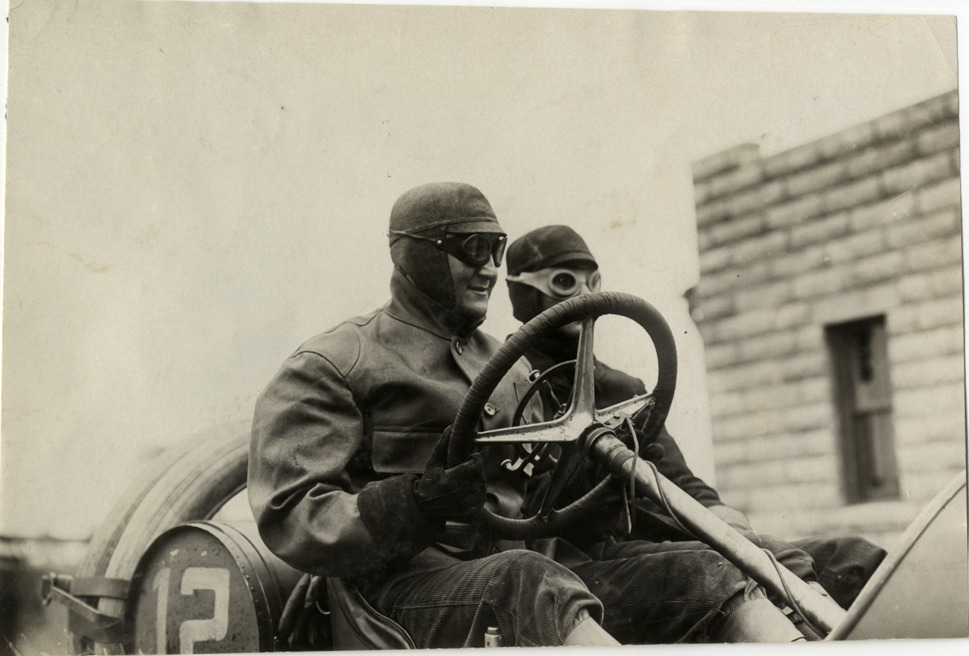 Close-up view of George Salzman and passenger in Thomas car no. 12 during the 1908 Vanderbilt Cup races on Long Island, New York. Handwritten on back: "Geo. Salzman. Races and racing--Vanderbilt Cup races, 1908."