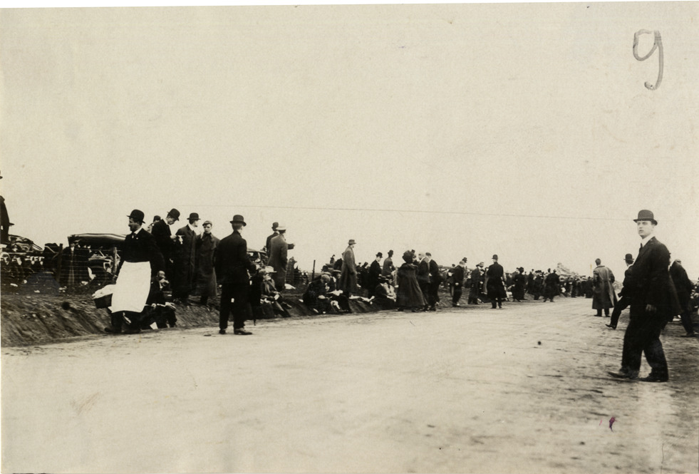 Man selling sandwiches to spectators on roadside, 1908 Vanderbilt Cup races
