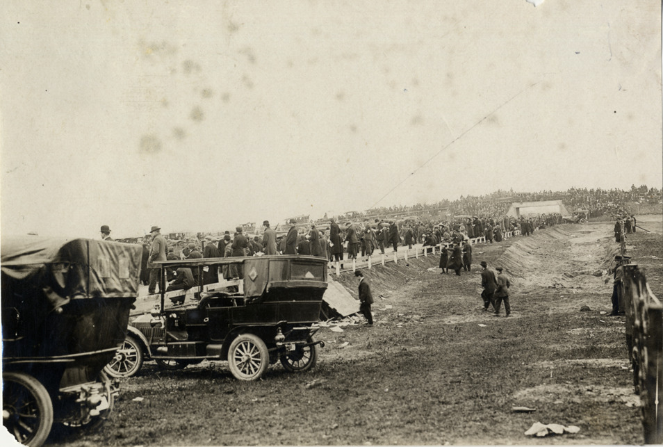 View of spectators with their cars on roadside near bridge during the 1908 Vanderbilt Cup races on Long Island, New York. Stamped on back: "Spooner & Wells, Inc., photographers, telephones 3472-3473 Columbus, 1931 Broadway, New York." Handwritten on back: "The bridge below the grand stand. Races and racing--Vanderbilt Cup races, 1908."