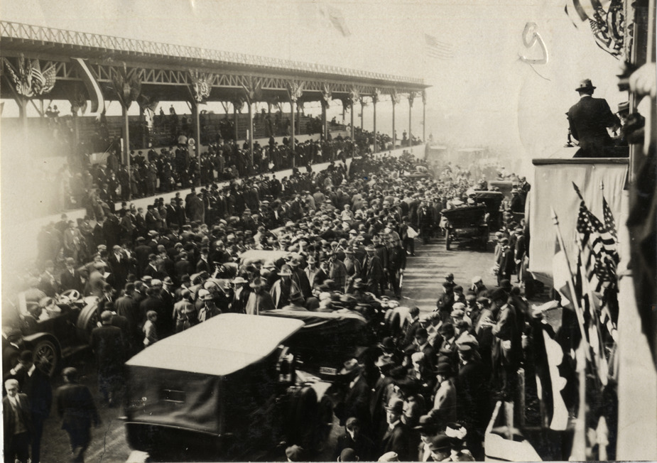 View of crowd and cars in front of grandstand during the 1908 Vanderbilt Cup races on Long Island, New York. Stamped on back: "Spooner & Wells, Inc., photographers, telephones 3472-3473 Columbus, 1931 Broadway, New York." Handwritten on back: "Races and racing--Vanderbilt Cup races, 1908."