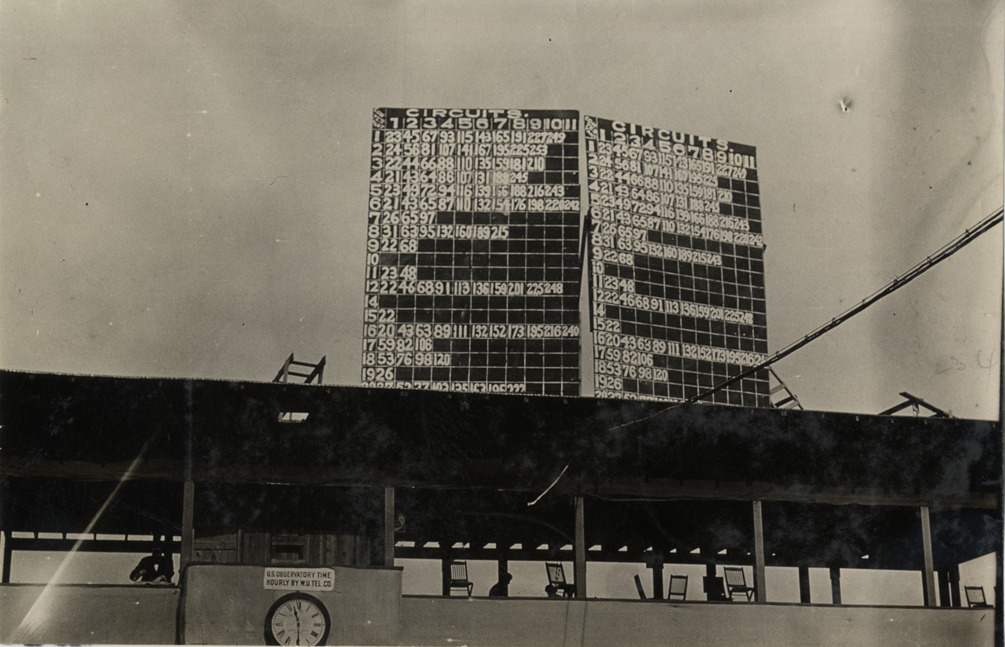 View of scoreboard atop officials' stand during the 1908 Vanderbilt Cup races on Long Island, New York. Clock is displayed on facade. Stamped on back: "Spooner & Wells, Inc., photographers, telephones 3472-3473 Columbus, 1931 Broadway, New York." Handwritten on back: "Races and racing--Vanderbilt Cup races, 1908."