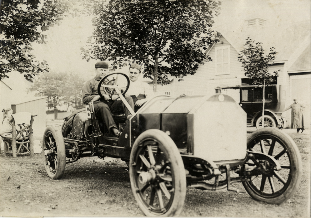 View of Herbert Lytle and passenger posing in Isotta-Fraschini car no. 6 during the 1908 Vanderbilt Cup races on Long Island, New York. Stamped on back: "Spooner & Wells, Inc., photographers, telephones 3472-3473 Columbus, 1931 Broadway, New York." Handwritten on back: "Isotta. Races and racing--Vanderbilt Cup races, 1908."