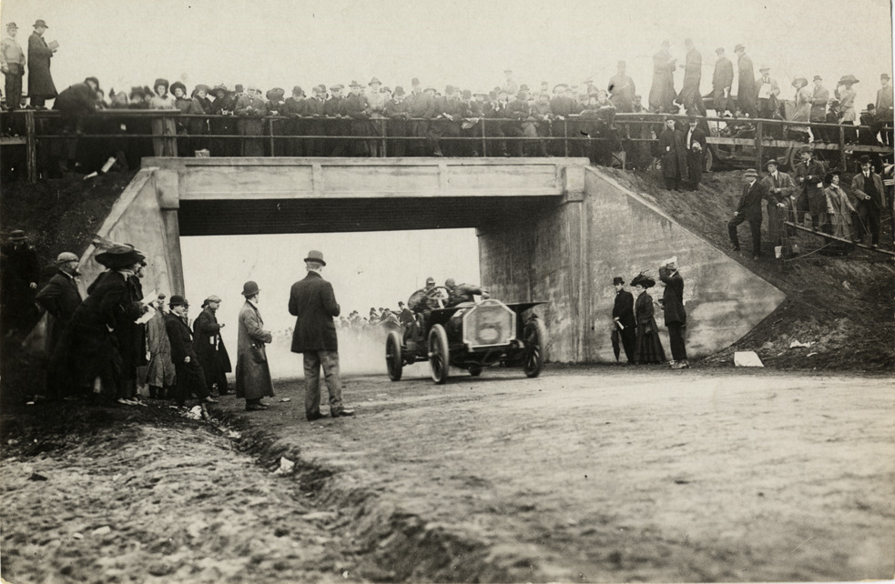 Racecar passing under bridge, 1908 Vanderbilt Cup races