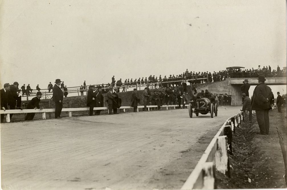 View of driver and passenger racing car no. 12 during the 1908 Vanderbilt Cup races on Long Island, New York. Spectators watch from bridge in background. Stamped on back: "Spooner & Wells, Inc., photographers, telephones 3472-3473 Columbus, 1931 Broadway, New York." Handwritten on back: "Races and racing--Vanderbilt Cup races, 1908."