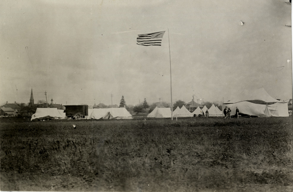 View of tents in Irish Volunteers camp during the 1908 Vanderbilt Cup races on Long Island, New York. American flag displayed on flagpole. Stamped on back: "Spooner & Wells, Inc., photographers, telephones 3472-3473 Columbus, 1931 Broadway, New York." Handwritten on back: "Irish Volunteers camp. Races and racing--Vanderbilt Cup races, 1908."