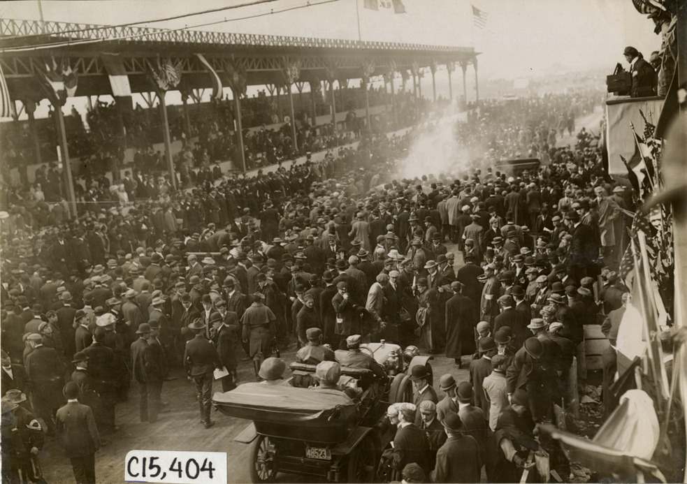 Crowd and automobiles in front of grandstand, 1908 Vanderbilt Cup races