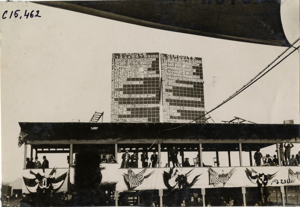 View of scoreboard atop judges' or officials' stand during the 1908 Vanderbilt Cup races on Long Island, New York. Stamped on back: "Photo by N. Lazarnick, 29 West 42nd Street, N.Y., tel. 594 Bryant." Handwritten on back: "Races and racing--Vanderbilt Cup races, 1908."