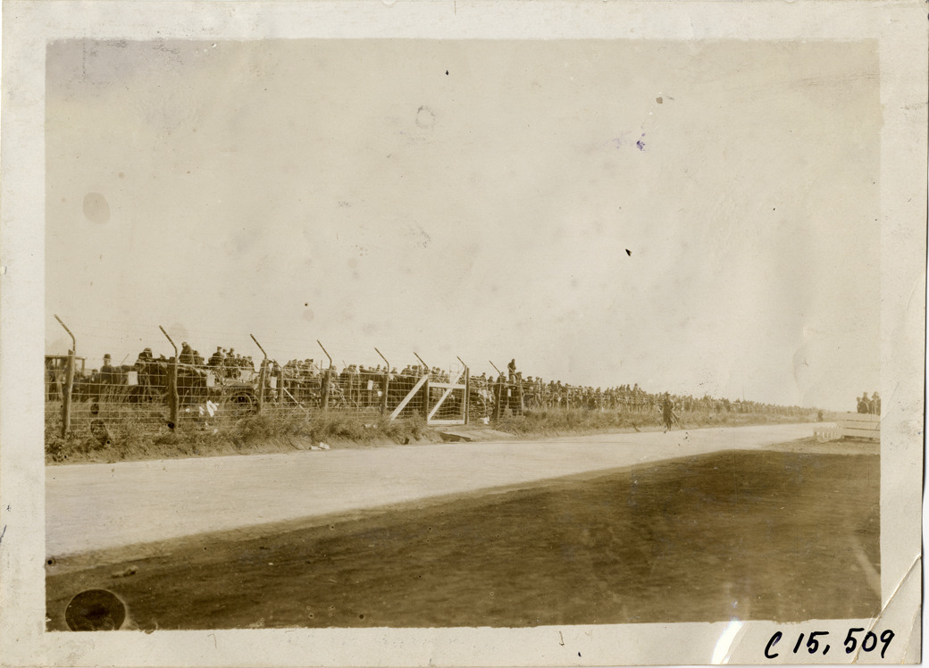 View of spectators standing behind fence on roadside during the 1909 Vanderbilt Cup races on Long Island, New York. Stamped on back: "Photo by Spooner & Wells, Inc. 1931 Broadway, N.Y." Handwritten on back: "Races and racing--Vanderbilt Cup races, 1909."
