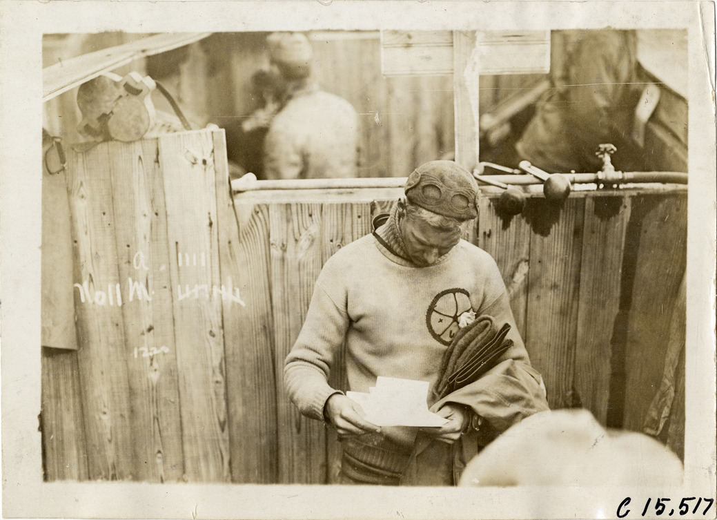 View of driver in pits looking at a document during the 1909 Vanderbilt Cup races on Long Island, New York. Stamped on back: "Photo by Spooner & Wells, Inc. 1931 Broadway, N.Y." Handwritten on back: "Races and racing--Vanderbilt Cup races, 1909."