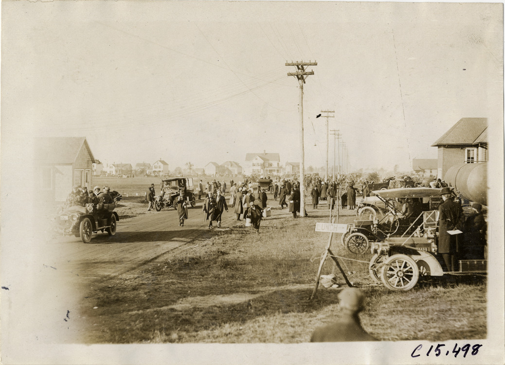View of cars and spectators on road during the 1909 Vanderbilt Cup races on Long Island, New York. Stamped on back: "Photo by Spooner & Wells, Inc. 1931 Broadway, N.Y." Handwritten on back: "Races and racing--Vanderbilt Cup races, 1909."
