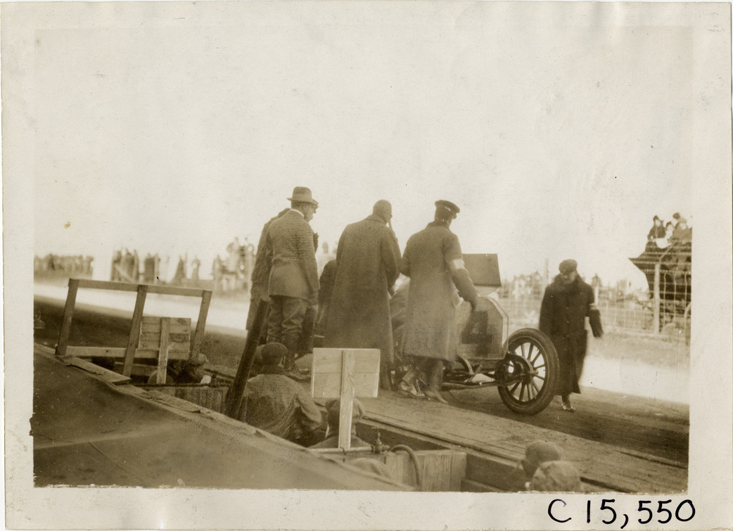 Racecar parked in front of pits, 1909 Vanderbilt Cup races