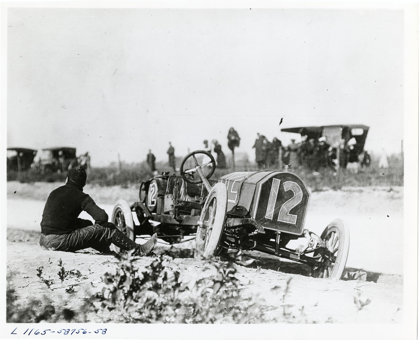 Driver sitting with racecar on roadside, 1909 Vanderbilt Cup races