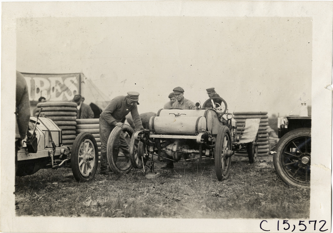 Men changing tires on racecar, 1909 Vanderbilt Cup races