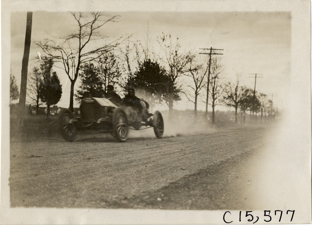 View of driver and passenger racing car during the 1909 Vanderbilt Cup races on Long Island, New York. Stamped on back: "Photo by Spooner & Wells, Inc. 1931 Broadway, N.Y." Handwritten on back: "Races and racing--Vanderbilt Cup races, 1909."