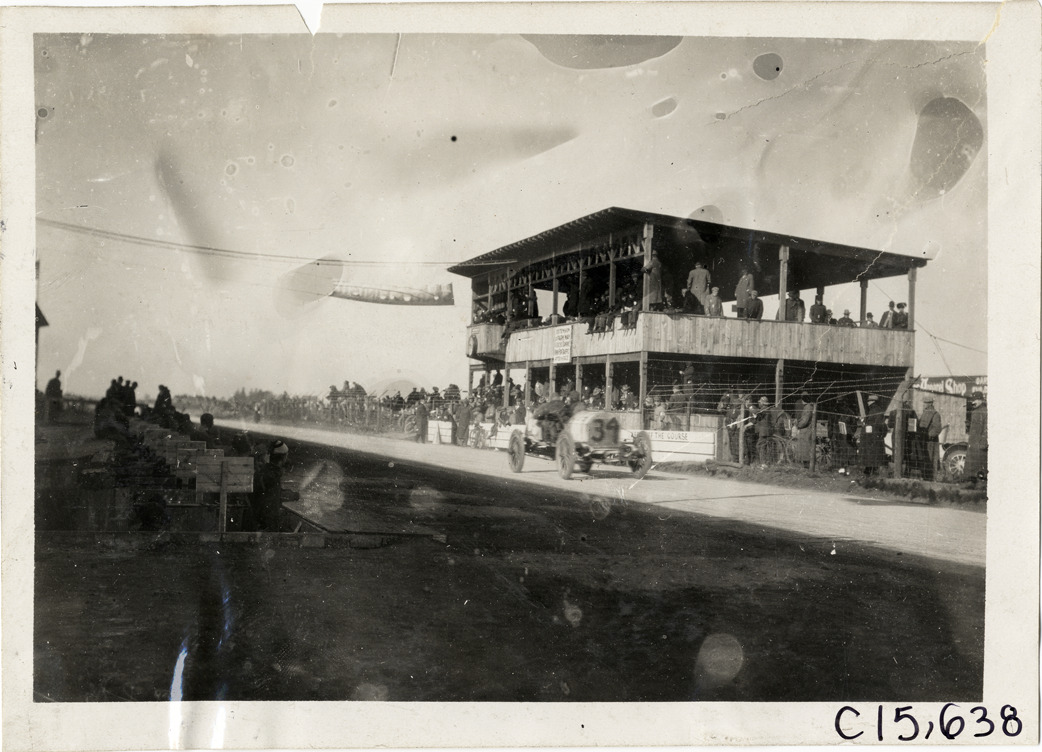 View of driver and passenger racing car no. 34 past timers' and officials' stand during the 1909 Vanderbilt Cup races on Long Island, New York. Stamped on back: "Spooner & Wells, Inc., photographers, telephones 3472-3473 Columbus, 1931 Broadway, New York." Handwritten on back: "Races and racing--Vanderbilt Cup races, 1909."