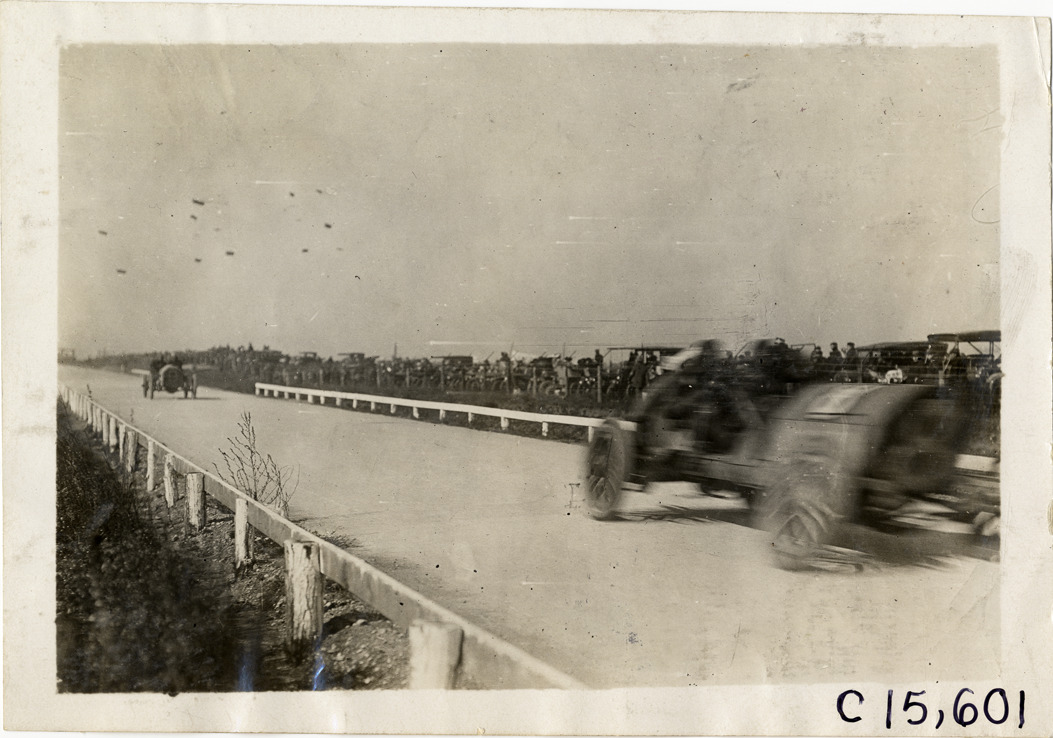 View of two cars racing past spectators during the 1909 Vanderbilt Cup races on Long Island, New York. Car no. 8 in foreground. Stamped on back: "Photo by Spooner & Wells, Inc. 1931 Broadway, N.Y." Handwritten on back: "Races and racing--Vanderbilt Cup races, 1909."