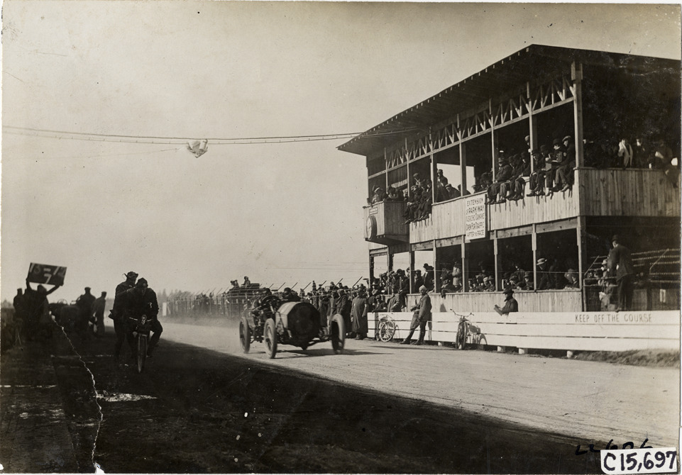 Driver and passenger in racecar, 1909 Vanderbilt Cup races