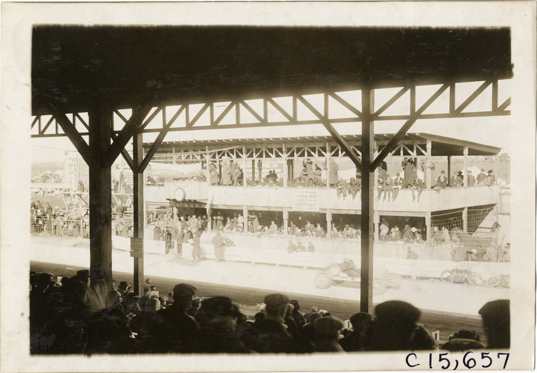 View from grandstand of timers' and officials' stand during the 1909 Vanderbilt Cup races on Long Island, New York. Stamped on back: "Photo by Spooner & Wells, Inc. 1931 Broadway, N.Y." Handwritten on back: "Races and racing--Vanderbilt Cup races, 1909."