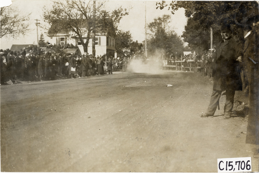 View of spectators watching car, partially obscured by cloud of dust, at Hicksville turn during the 1909 Vanderbilt Cup races on Long Island, New York. Handwritten on back: "Races and racing--Vanderbilt Cup races, 1909."