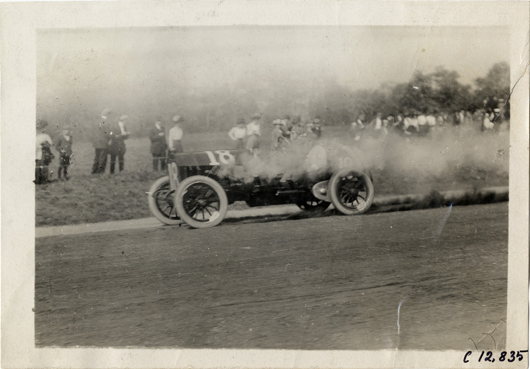View of driver racing car no. 18 past spectators during the 1909 Fairmount Park races in Philadelphia, Pennsylvania. Stamped on back: "Photo by Spooner & Wells, Inc. 1931 Broadway, N.Y." Handwritten on back: "Races and racing--Fairmount Park races, 1909."
