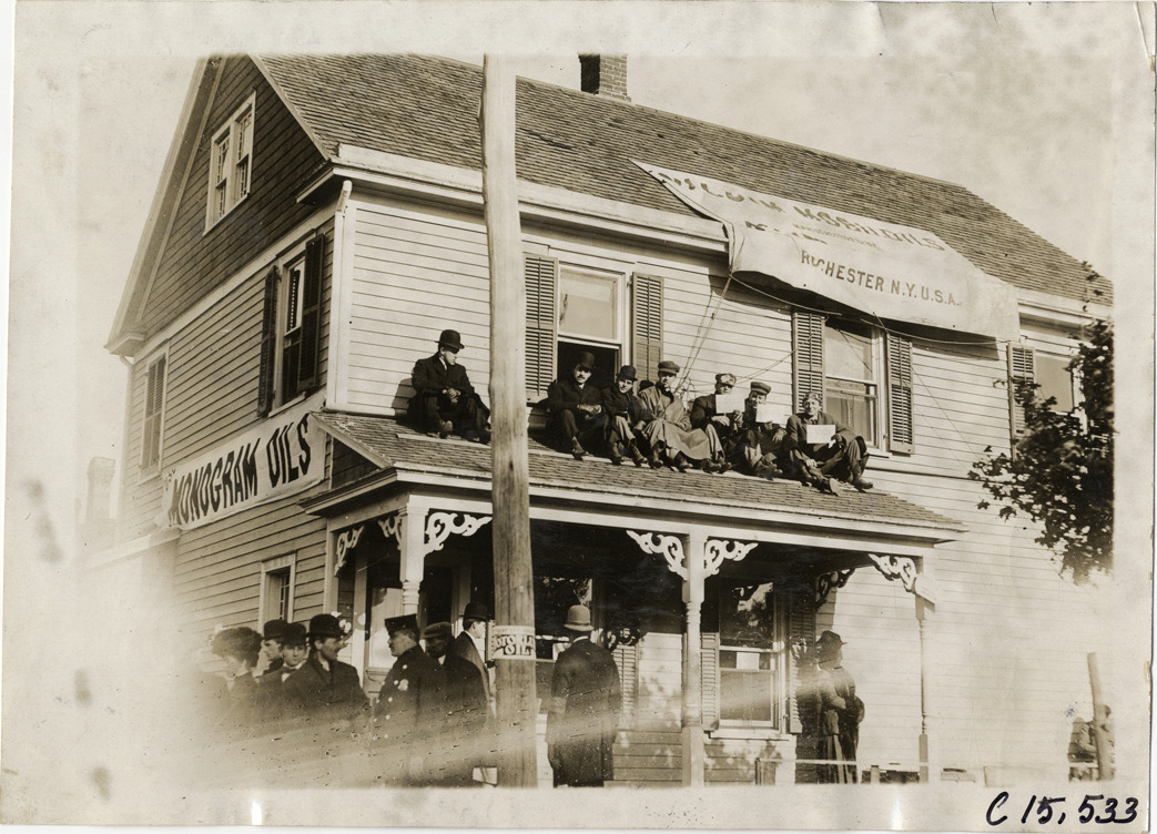 View of men sitting on porch roof of wooden-frame house during the 1909 Vanderbilt Cup races on Long Island, New York. Monogram oils and Vacuum Mobiloils banners displayed on house. Stamped on back: "Photo by Spooner & Wells, Inc. 1931 Broadway, N.Y." Handwritten on back: "Races and racing--Vanderbilt Cup races, 1909."