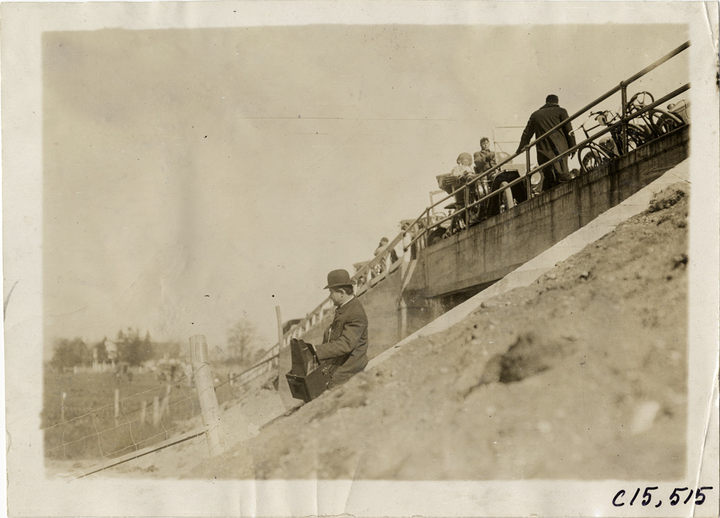 Photographer on bridge embankment, 1909 Vanderbilt Cup races