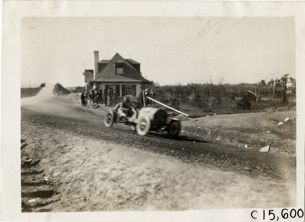 Racecar passing Meadow Brook toll lodge, 1909 Vanderbilt Cup races