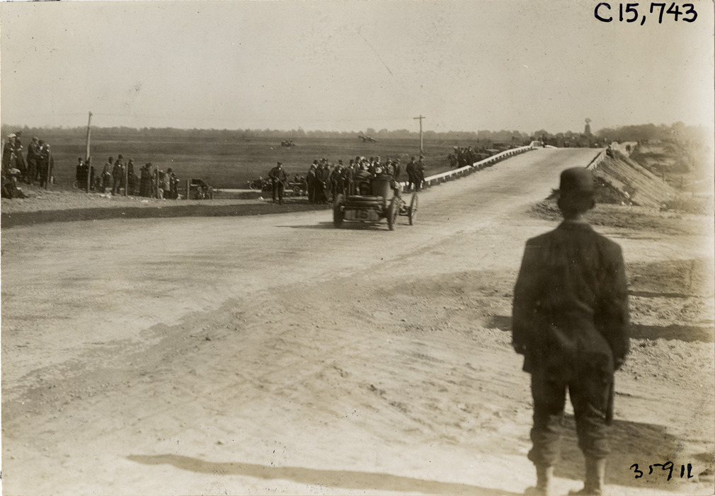 Rear view of driver and passenger racing car no. 16 past spectators during the 1909 Vanderbilt Cup races on Long Island, New York. Man stands in foreground. Stamped on back: "Photo by N. Lazarnick. 244-6-8 W. 42nd Street, N.Y. Tel. 594 Bryant. In ordering duplicates mention number on back of this print." Handwritten on back: "Races and racing--Vanderbilt Cup races, 1909."