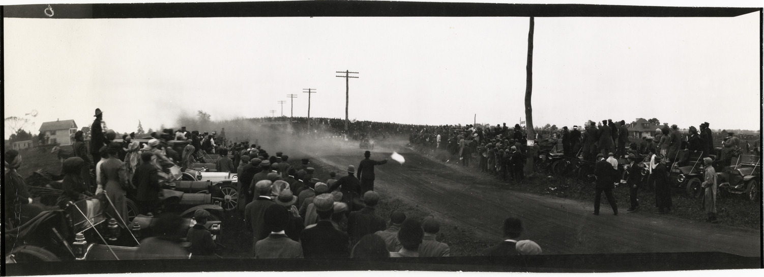 Spectators and automobiles on roadside, 1909 Vanderbilt Cup races