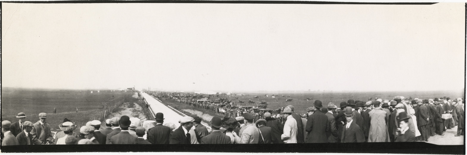 View of spectators and cars on roadside during the 1909 Vanderbilt Cup races on Long Island, New York. Handwritten on back: "Races and racing--Vanderbilt Cup races, 1909."