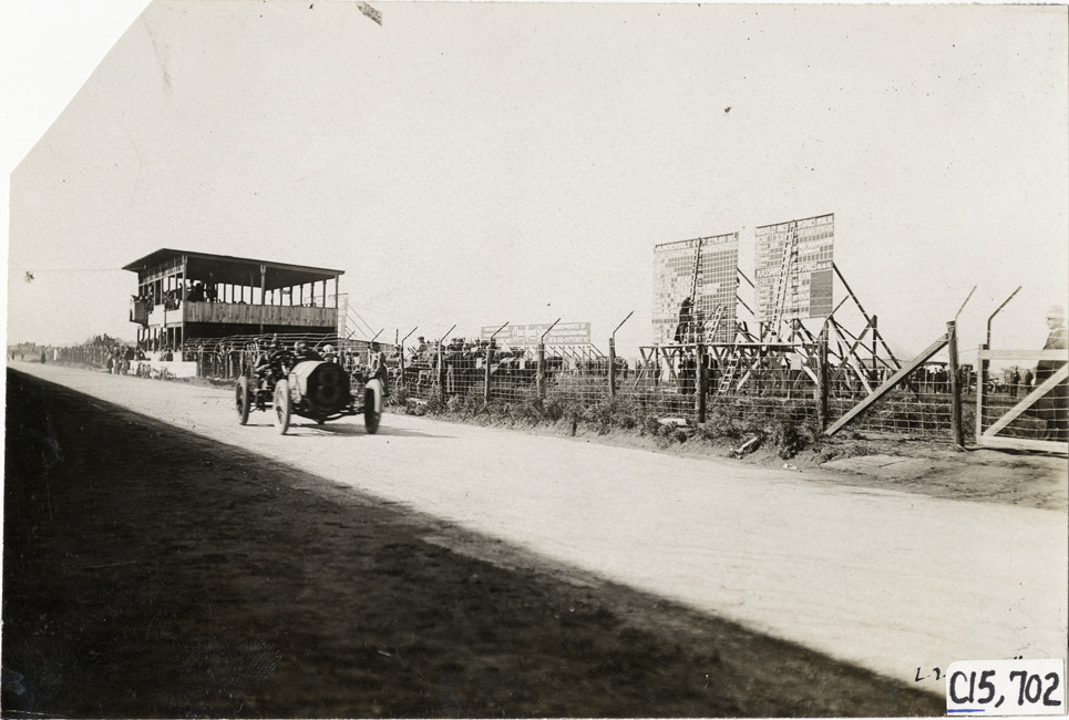 View of driver and passenger racing car no. 8 past officials' stand and scoreboards during the 1909 Vanderbilt Cup races on Long Island, New York. Stamped on back: "Photo by N. Lazarnick. 244-6-8 W. 42nd Street, N.Y. Tel. 594 Bryant. In ordering duplicates mention number on back of this print." Handwritten on back: "Races and racing--Vanderbilt Cup races, 1909."