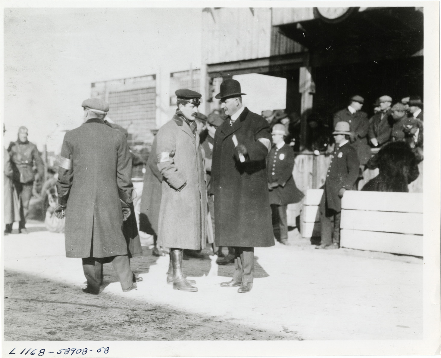 View of William K. Vanderbilt, Jr. and racing official during the 1909 Vanderbilt Cup races on Long Island, New York. Handwritten on back: "Races and racing--Vanderbilt Cup races, 1909."