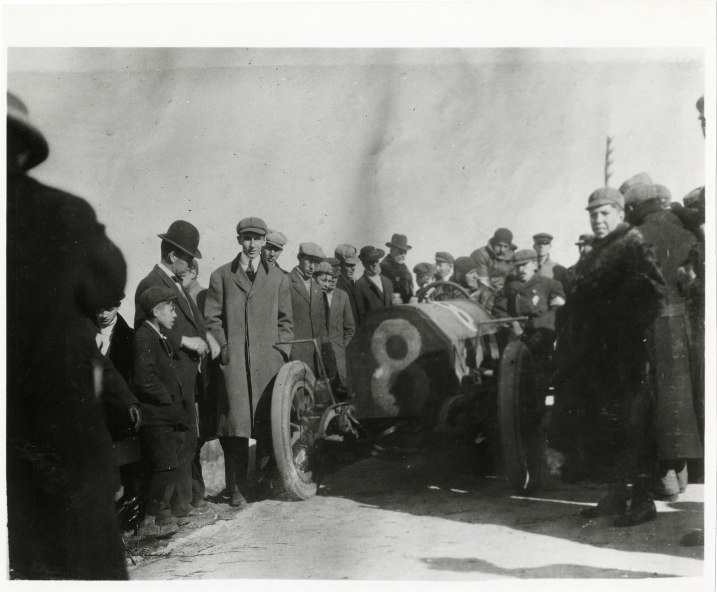 View of crowd surrounding driver and passenger in car no. 8 during the 1909 Vanderbilt Cup races on Long Island, New York. Handwritten on back: "Races and racing--Vanderbilt Cup races, 1909."