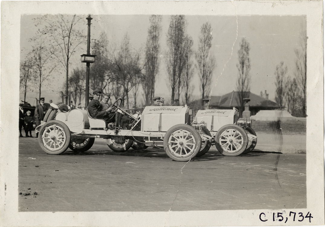 View of drivers and passengers posing in two National cars during the 1909 Vanderbilt Cup races on Long Island, New York. Stamped on back: "Photo by Spooner & Wells, Inc. 1931 Broadway, N.Y." Handwritten on back: "Races and racing--Vanderbilt Cup races, 1909."