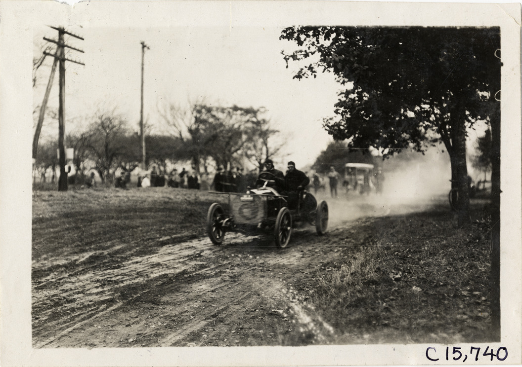 View of driver and passenger racing car no. 6 past spectators during the 1909 Vanderbilt Cup races on Long Island, New York. Stamped on back: "Photo by Spooner & Wells, Inc. 1931 Broadway, N.Y." Handwritten on back: "Races and racing--Vanderbilt Cup races, 1909."