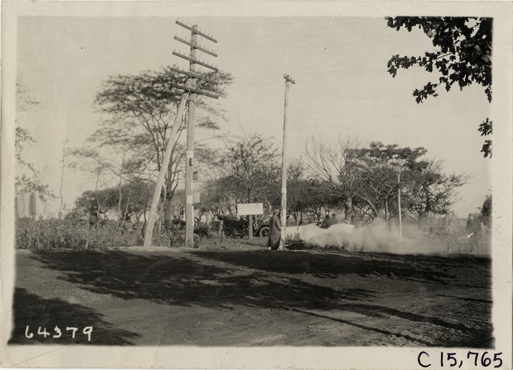 View of Pope-Hartford car at Westbury Corner during the 1910 Vanderbilt Cup races on Long Island, New York. Spectators and automobiles in background. Stamped on back: "Spooner & Wells, Inc., photographers, telephones 3472-3473 Columbus, 1931 Broadway, New York." Handwritten on back: "Pope Hartford at Westbury Corner. Races and racing--Vanderbilt Cup races, 1910."