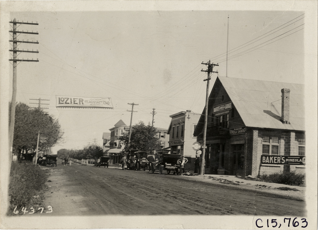 View of Lozier headquarters banner displayed in front of Baker's Mineola Garage during the 1910 Vanderbilt Cup races on Long Island, New York. Automobiles and commercial buildings in background. Stamped on back: "Spooner & Wells, Inc., photographers, telephones 3472-3473 Columbus, 1931 Broadway, New York." Handwritten on back: "Races and racing--Vanderbilt Cup races, 1910."