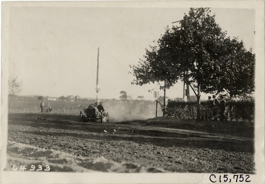 View of driver and passenger racing Marmon car past spectators during the 1910 Vanderbilt Cup races on Long Island, New York. Stamped on back: "Spooner & Wells, Inc., photographers, telephones 3472-3473 Columbus, 1931 Broadway, New York." Handwritten on back: "Dawson, Marmon. Races and racing--Vanderbilt Cup races, 1910."