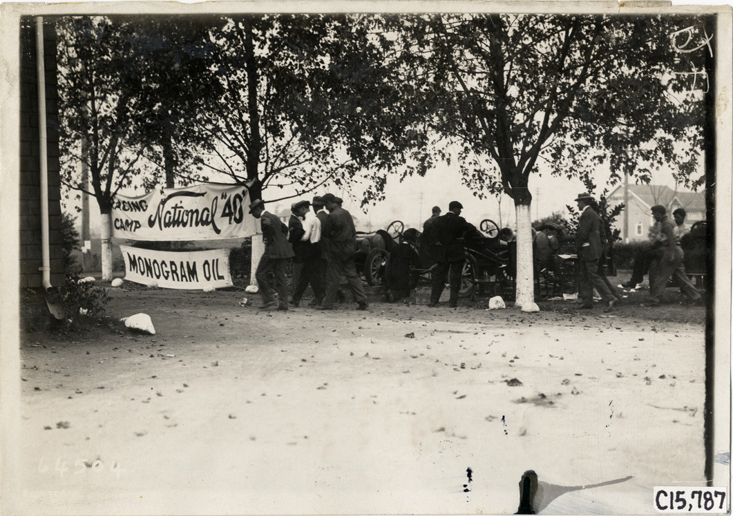 View of men and cars at National Racing Camp on roadside during the 1910 Vanderbilt Cup races on Long Island, New York. Banners displayed between trees read: "National '40' racing camp, Monogram oil." Stamped on back: "Spooner & Wells, Inc., photographers, telephones 3472-3473 Columbus, 1931 Broadway, New York." Handwritten on back: "Races and racing--Vanderbilt Cup races, 1910."