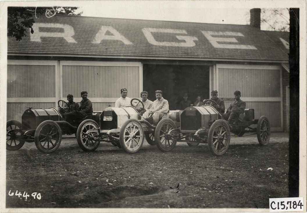 View of drivers and passengers in three cars parked in front of garage during the 1910 Vanderbilt Cup races on Long Island, New York. Garage in background. Stamped on back: "Spooner & Wells, Inc., photographers, telephones 3472-3473 Columbus, 1931 Broadway, New York." Handwritten on back: "Races and racing--Vanderbilt Cup races, 1910."