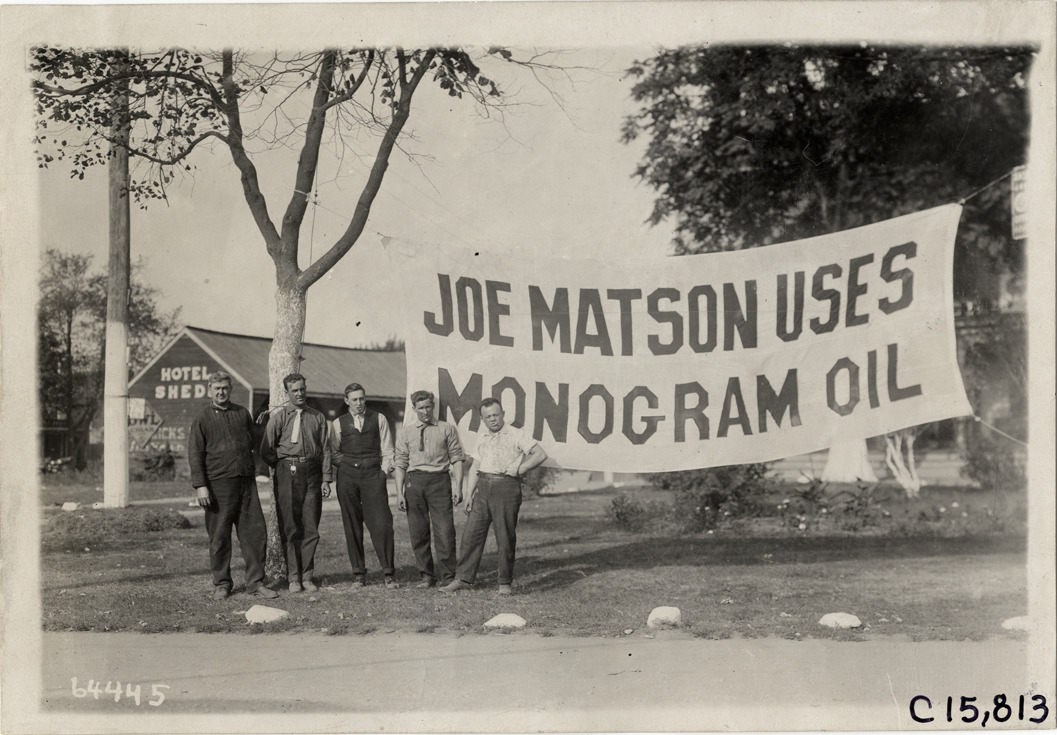 View of driver Joe Matson and four unidentified men posing in front of Monogram oil banner during the 1910 Vanderbilt Cup races on Long Island, New York. Banner reads: "Joe Matson uses Monogram oil." Stamped on back: "Spooner & Wells, Inc., photographers, telephones 3472-3473 Columbus, 1931 Broadway, New York." Handwritten on back: "Races and racing--Vanderbilt Cup races, 1910."