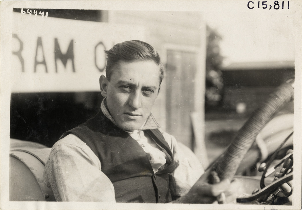 Close-up view of driver in car during the 1910 Vanderbilt Cup races on Long Island, New York. Stamped on back: "Spooner & Wells, Inc., photographers, telephones 3472-3473 Columbus, 1931 Broadway, New York." Handwritten on back: "Races and racing--Vanderbilt Cup races, 1910."