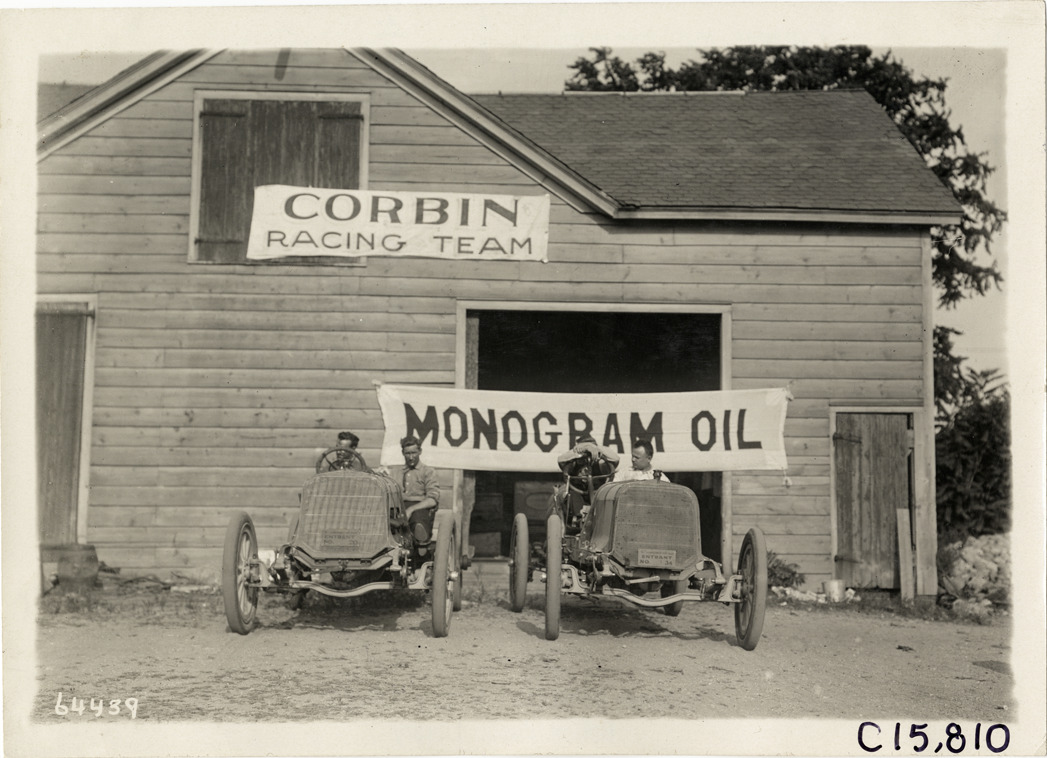 Drivers and passengers in two Corbin cars in front of wooden-frame garage during the 1910 Vanderbilt Cup races on Long Island, New York. "Corbin racing team" and "Monogram oil" banners displayed on front of garage. Stamped on back: "Spooner & Wells, Inc., photographers, telephones 3472-3473 Columbus, 1931 Broadway, New York." Handwritten on back: "Races and racing--Vanderbilt Cup races, 1910."