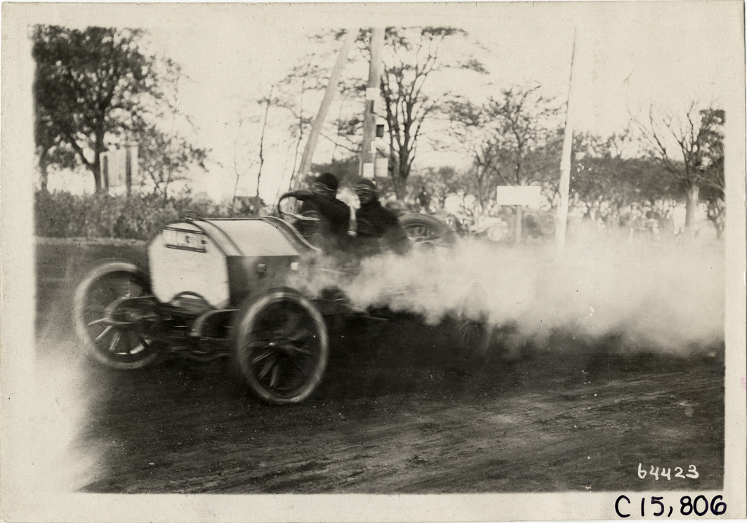 View of driver and passenger racing car past spectators during the 1910 Vanderbilt Cup races on Long Island, New York. Stamped on back: "Spooner & Wells, Inc., photographers, telephones 3472-3473 Columbus, 1931 Broadway, New York." Handwritten on back: "Races and racing--Vanderbilt Cup races, 1910."